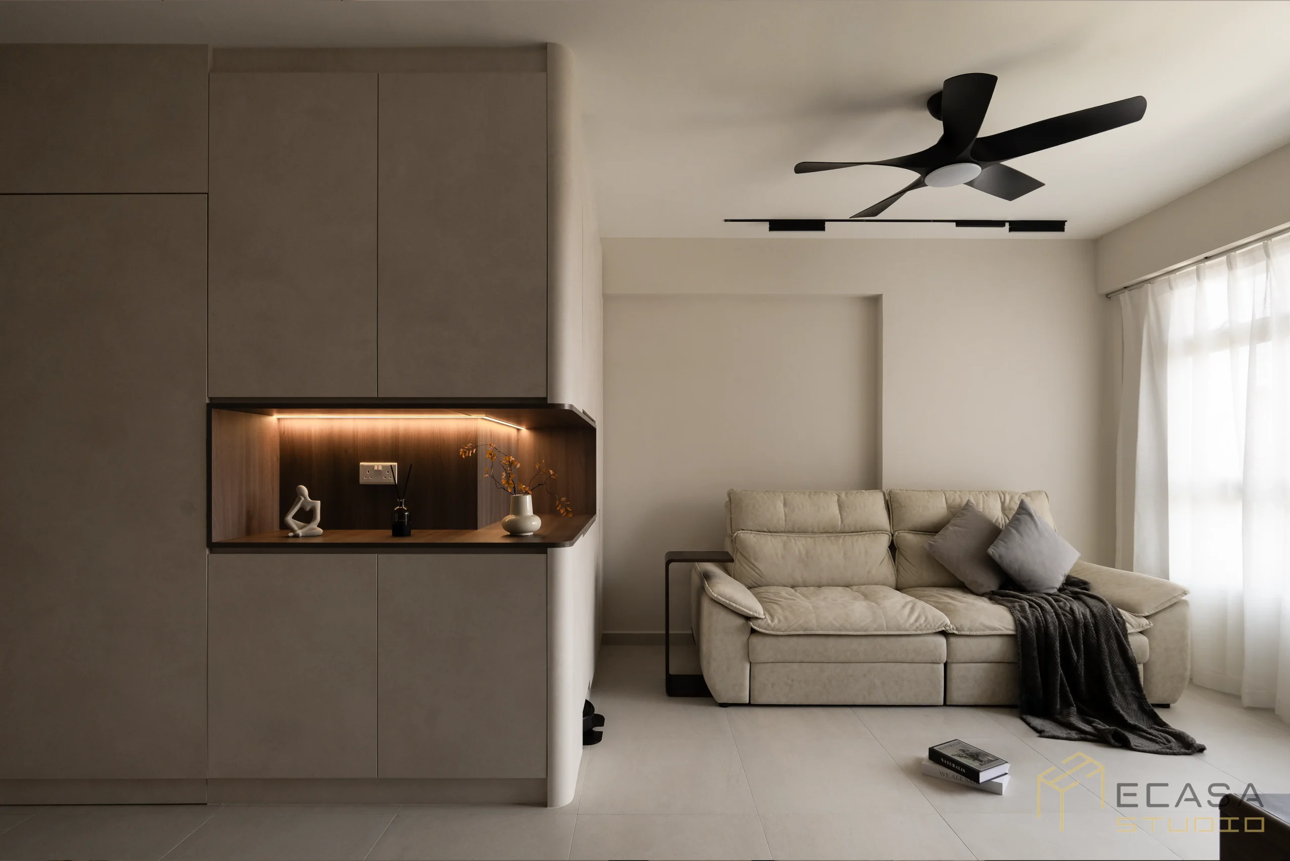 A 4-room flat is not huge. Think about how to use each room with early space planning. For example, if you or your spouse works from home, set aside one bedroom as a home office or study with a proper desk and storage. Alternatively, one room could be turned into a walk-in wardrobe or hobby room if not needed as a bedroom immediately. Having a dedicated function for each space prevents waste and clutter. Ample storage helps keep the flat neat and spacious. Opt for built-in cabinets that reach up to the ceiling to maximise vertical space. This is great for tucking away bulky items like luggage or winter clothes that you rarely use. While open shelving can display your books, collectibles or figurines, be mindful of visual clutter and dust. Open shelves require regular cleaning since items are exposed to dust and grease. In contrast, closed cabinets keep your belongings hidden and dust accumulation is greatly reduced behind closed doors. A balanced approach is to use mostly closed storage for a tidy appearance, and limit open display shelves to a few well-curated decor pieces that you won’t mind cleaning. By planning your space usage intentionally, you can make a big difference in how spacious your BTO flat feels.