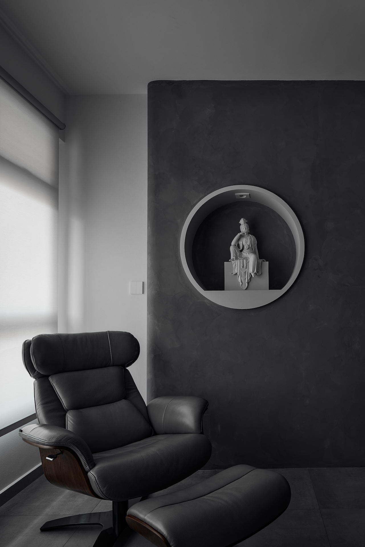 The space is anchored by a matte charcoal limewash wall that serves as a dramatic backdrop for a sculptural focal point, blending art with functionality. The use of exposed materials, such as the metal table legs and the concrete-like floor, highlights the industrial theme, while the clean lines of the furniture maintain a modern and sleek appearance. The soft, natural lighting from the window adds warmth, contrasting with the cool tones of the space, creating a balanced and inviting atmosphere.