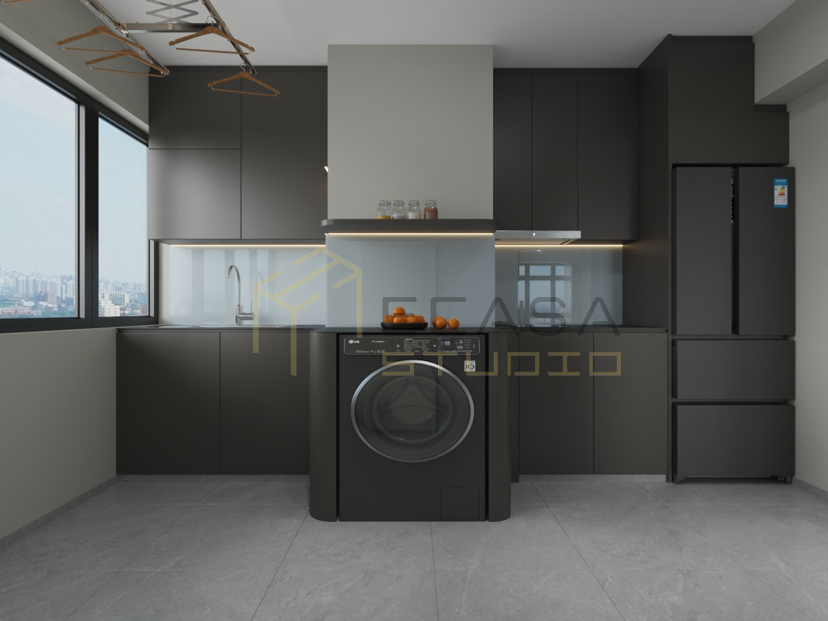 The dark tones in the cabinetry, coupled with subtle textural variations, create a space that is not only visually striking but also warm and inviting. This design is perfect for those who appreciate a contemporary yet timeless style, where the beauty lies in the simplicity and coherence of the overall composition.