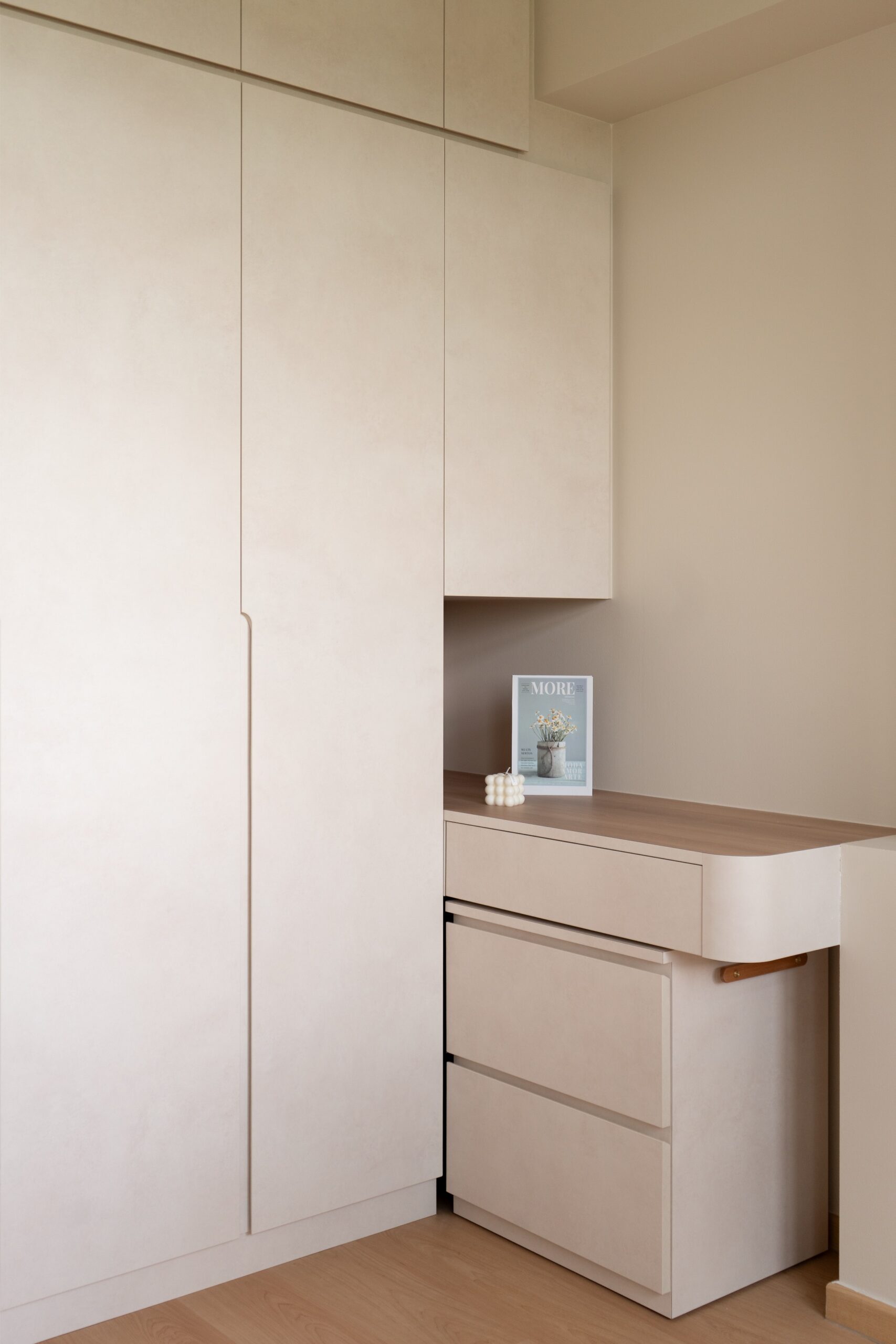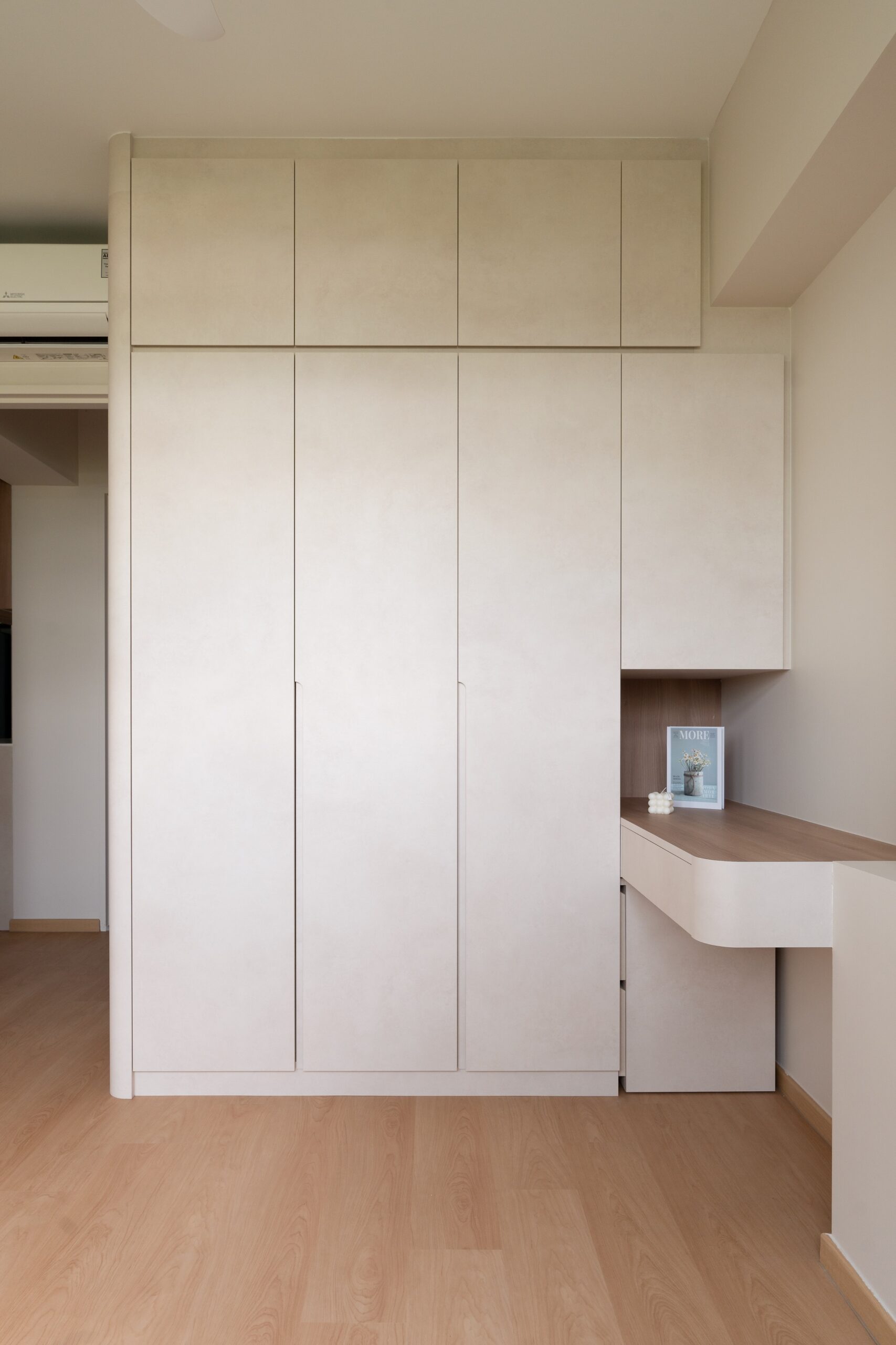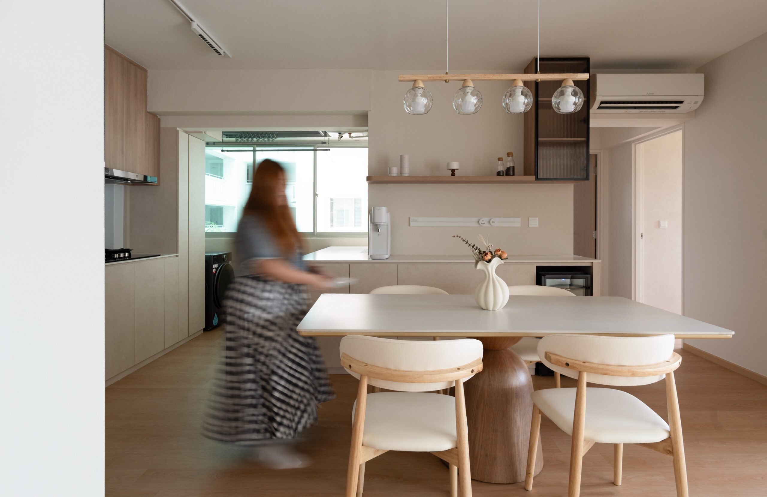 This interior embodies a Creamy Scandi style — a modern take on Scandinavian minimalism characterized by soft creamy tones, light wood textures, and gentle lighting.