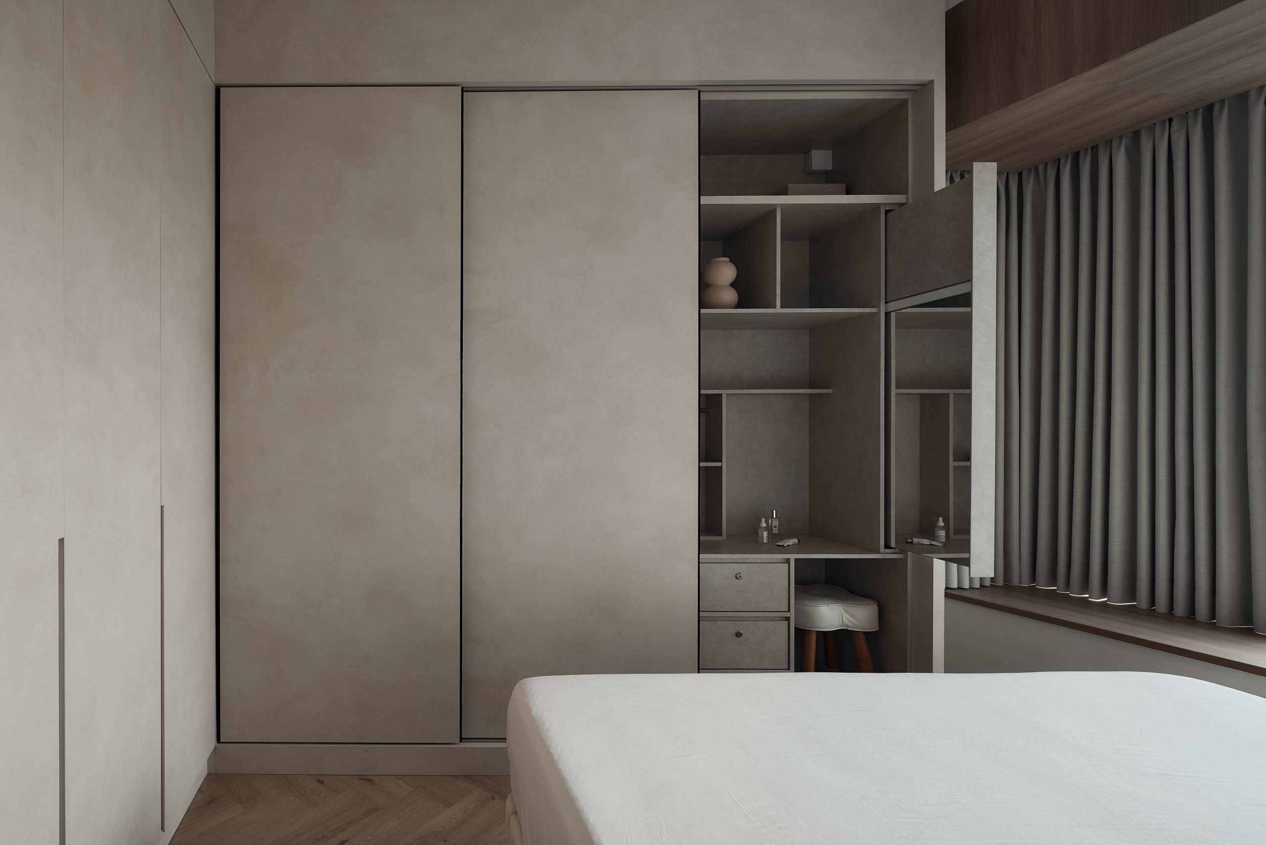 Clean lines and minimalistic furniture complement the soothing color palette, while thoughtful details, such as integrated shelving and subtle decor, add texture and depth.