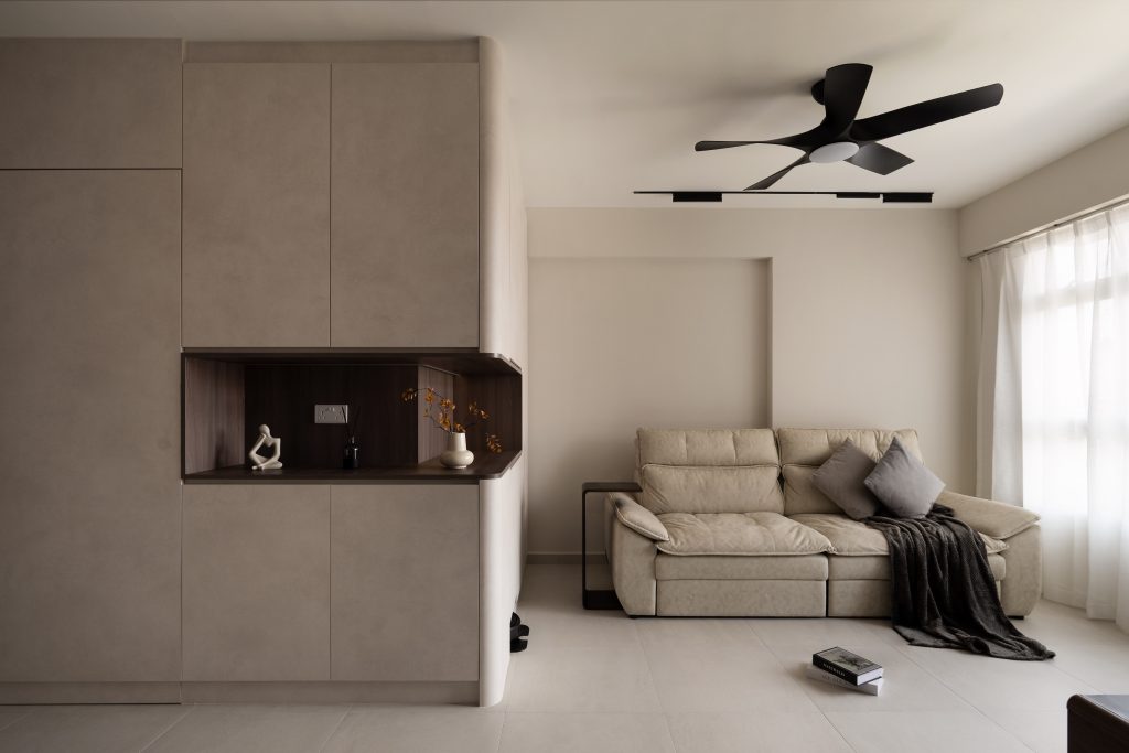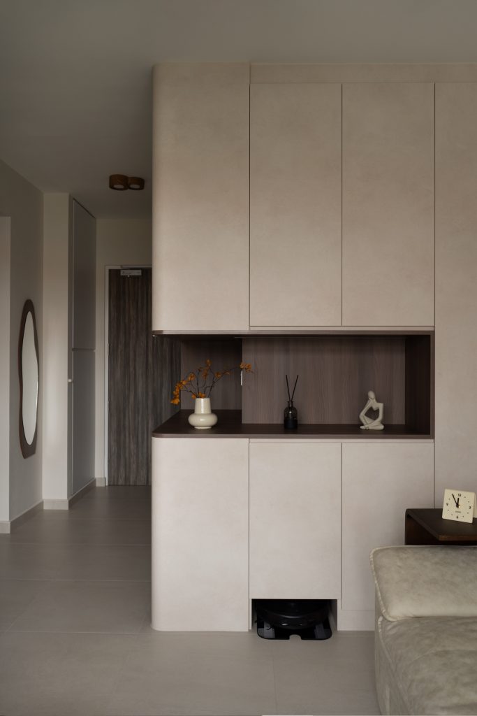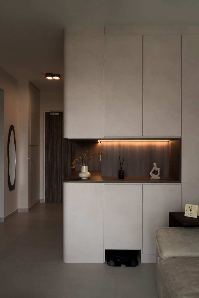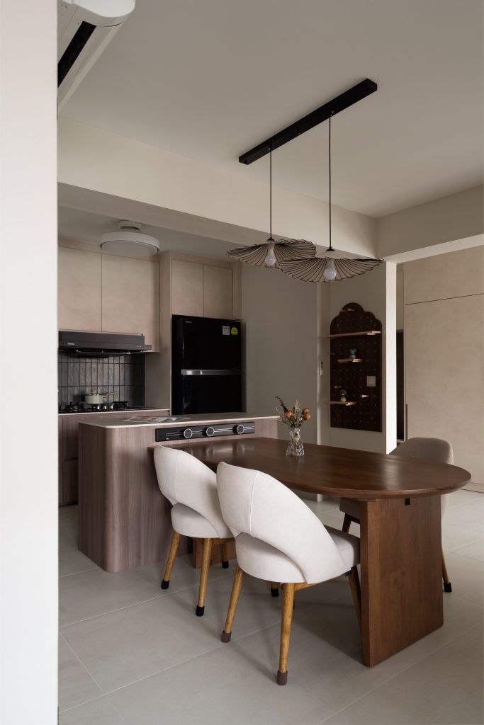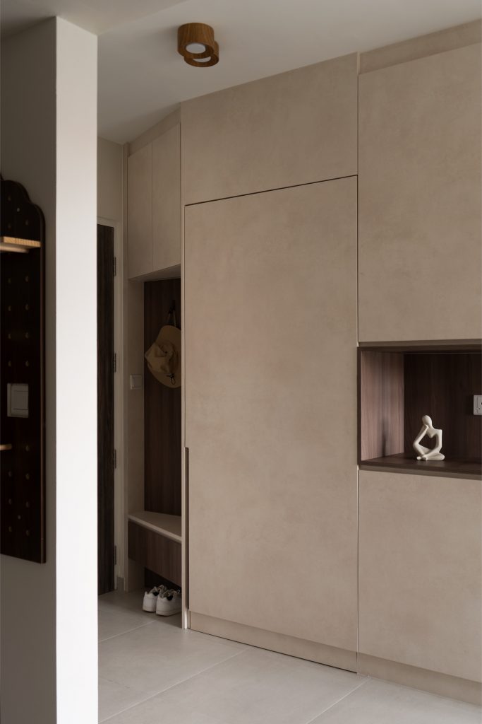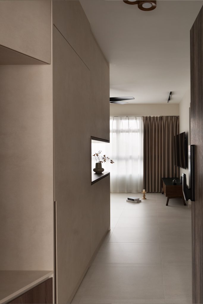 The overall result is a tranquil, livable environment that harmonizes minimalism with everyday practicality.