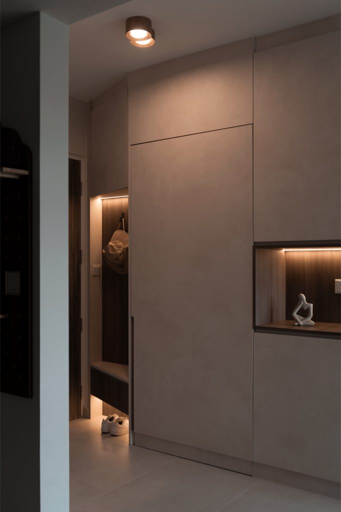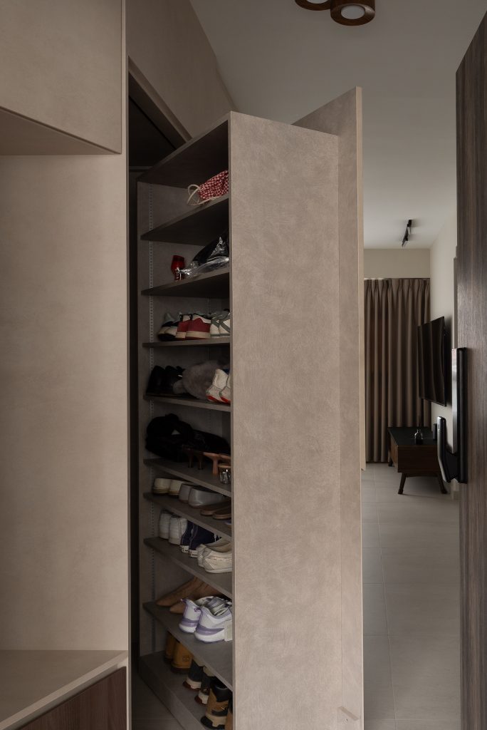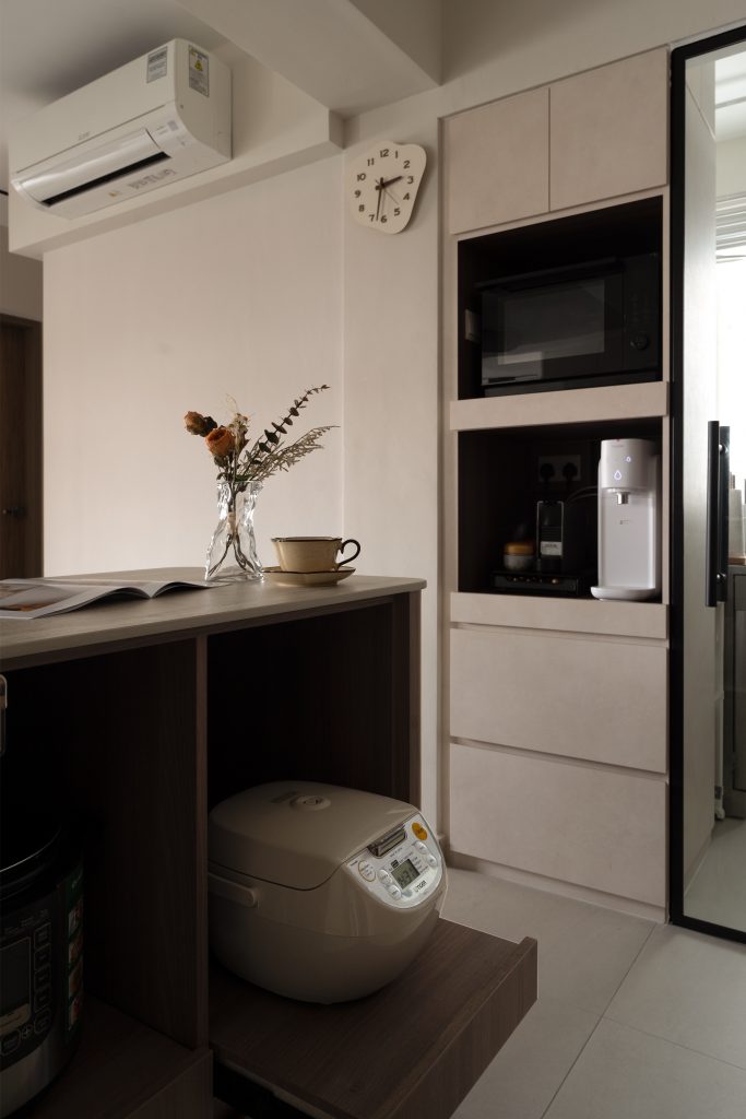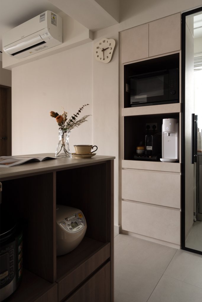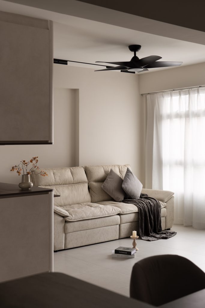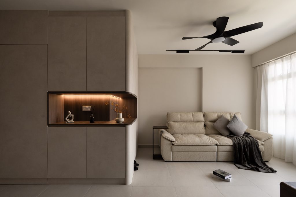 The overall result is a tranquil, livable environment that harmonizes minimalism with everyday practicality.