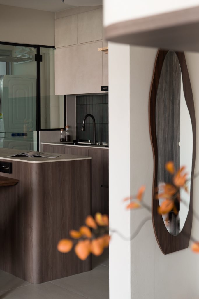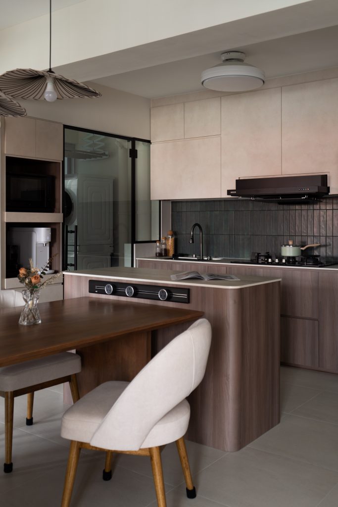 Every detail is intentional: the streamlined kitchen island doubles as a dining zone, and hidden storage maintains an uncluttered aesthetic.